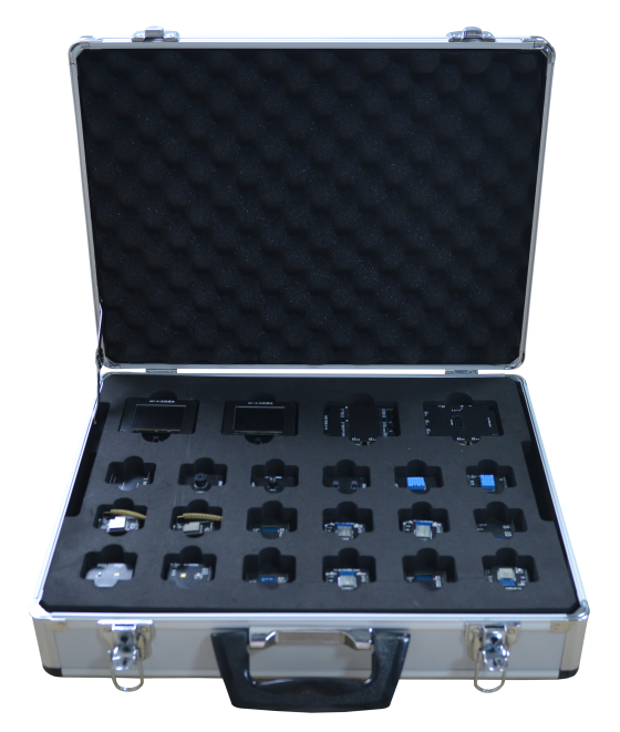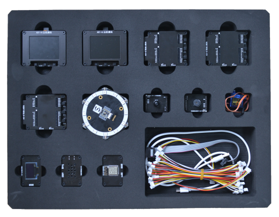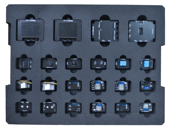 本設備采用(yòng)實驗箱形式,實驗箱内包含兩層内襯,内襯上(shàng)放(fàng)有(yǒu)無線通訊模塊(LoRa、低功耗WiFi、ZigBee、等),通用(yòng)模塊(按鍵、OLED 顯示、溫濕度、舵機、RFID、RGB彩燈、LED燈、蜂鳴器(qì)、人(rén)體感應、光(guāng)電模塊等),人(rén)工(gōng)智能(néng)模塊(k210主闆,攝像頭,顯示屏,聲音(yīn)采集模塊等),其他(tā)輔助材料(色塊,人(rén)臉模型,20種物(wù)體圖卡,條形碼圖卡,USB線等)。